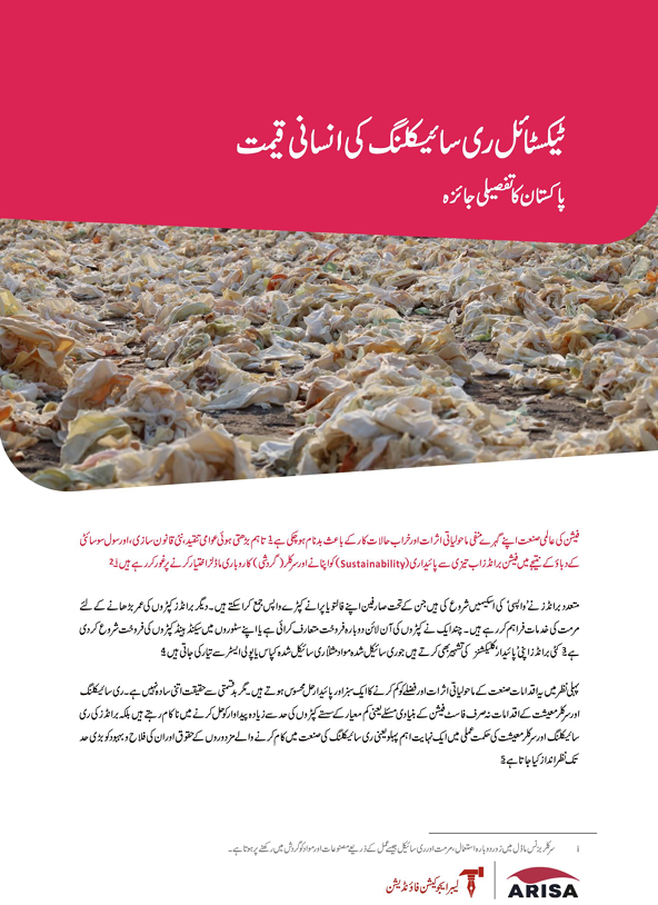 اریسا کی نئی اشاعت “ٹیکسٹائل ری سائیکلنگ کی انسانی قیمت: پاکستان کا ایک مطالعہ” پاکستان میں ٹیکسٹائل ری سائیکلنگ کی دنیا کی ایک جھلک پیش کرتی ہے۔ اس میں بڑے ٹیکسٹائل ری سائیکلنگ مراکز، ان کی تنظیم اور ساخت کو دکھایا گیا ہے، اور ان لوگوں کی آواز کو سامنے لایا گیا ہے جو اس عمل سے سب سے زیادہ قریب سے وابستہ ہیں: یعنی ری سائیکلنگ یونٹس کے مزدور اور مالکان۔
